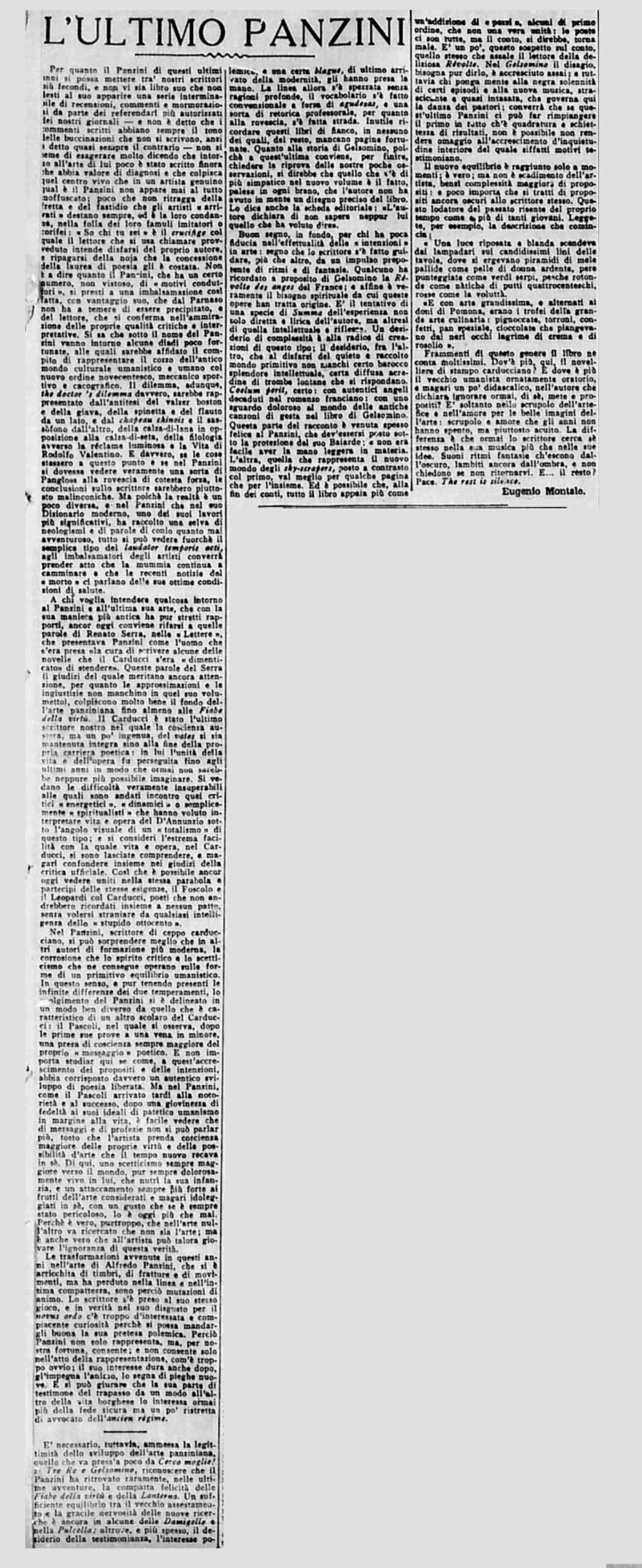 È il testo di critica più esteso che Montale dedicò a Panzini. Comparve su «L’Ambrosiano» l’11 aprile 1927: L’ultimo Panzini. Muove dalla convinzione che, pur essendo ormai uno scrittore che richiama su di sé una quantità di recensioni, “intorno all’arte di lui poco è stato scritto finora che abbia valore di diagnosi e che colpisca quel centro vivo che in un artista genuino qual è il Panzini non appare mai del tutto inoffuscato”. In seguito, sul «Corriere della Sera», Montale tornerà ancora ma solo con brevi accenni a Panzini.