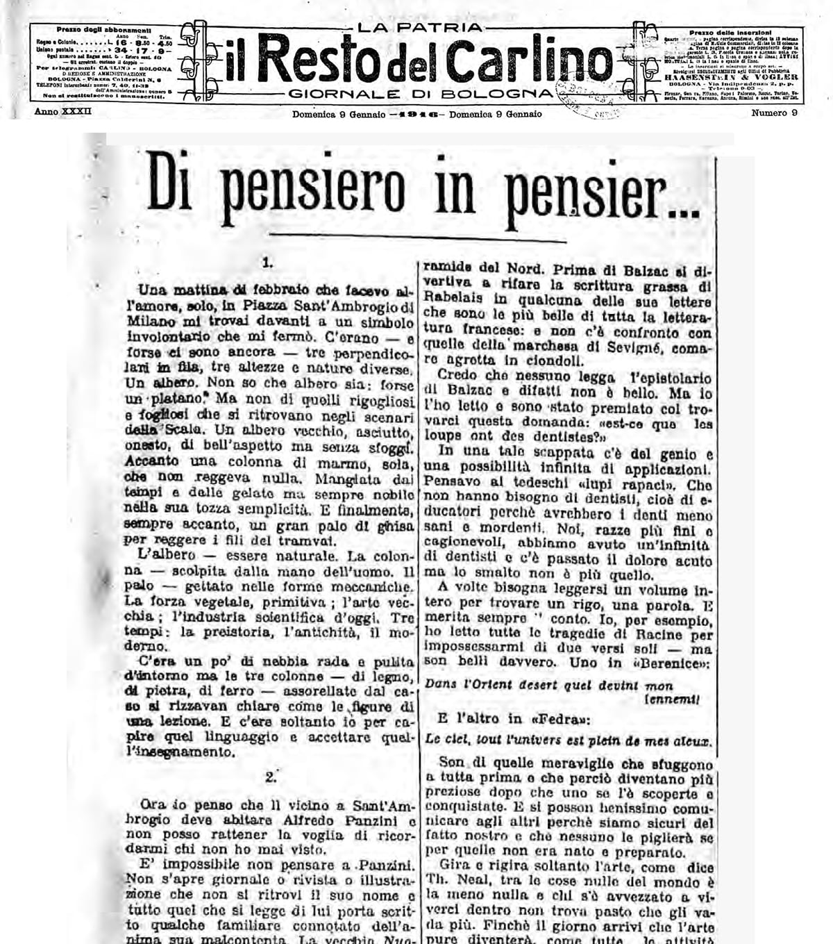 9 gennaio 1916. Sulla terza pagina de «Il Resto del Carlino» (alla quale collabora anche Panzini), Giovanni Papini scrive un pezzo dal titolo Di pensiero in pensier… Prende spunto dall’osservazione di un albero, di una colonna di marmo e “un gran palo di ghisa per reggere i fili del tranvai”, in piazza Sant’Ambrogio a Milano, “come le figure di una lezione”: “la forza vegetale, primitiva; l’arte vecchia; l’industria scientifica d’oggi: la preistoria, l’antichità, il moderno”. E poi, come scolpito all’interno di un articolo che parla anche d’altro, introduce la sua prima interpretazione di Alfredo Panzini, che si conclude con la celebre definizione: “Panzini sembra uno spirito semplice, può parere monotono, perfino. Ma leggetelo bene e con l’attenzione che merita la sciolta eleganza dell’arte sua delicata e sentirete che ariate di freddo e che infilate di pensieri difficili. È uno spirito di contrappunto che vive sulle variazioni e con pochi temi riesce a lavorare la realtà fino al punto di soffrire e di far soffrire”.