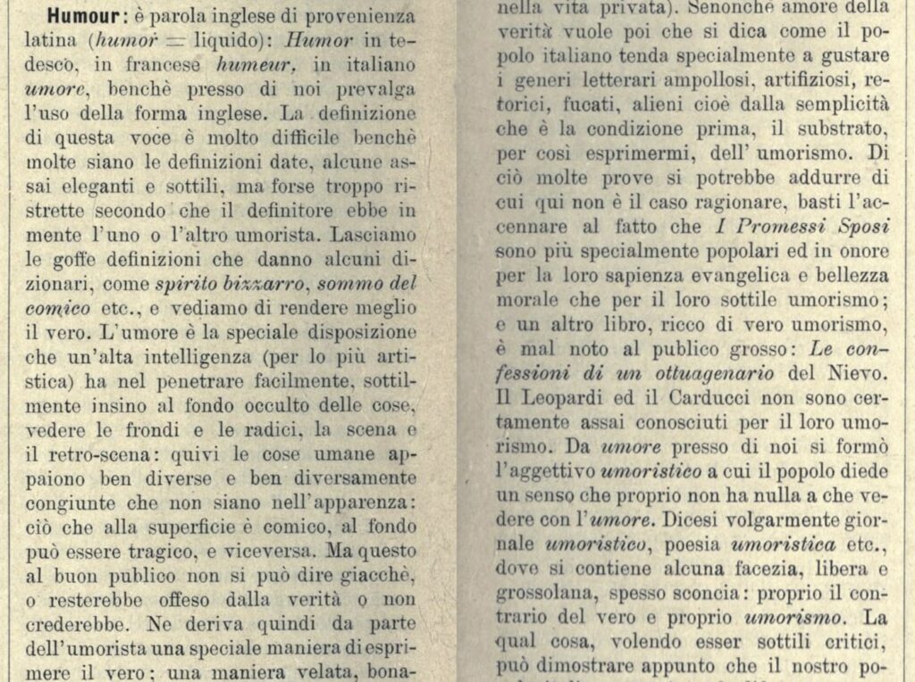 Humour: è parola inglese di provenienza latina (humor = liquido): Humor in tedesco, in francese humeur, in italiano umore, benché presso di noi prevalga l’uso della forma inglese. La definizione di questa voce è molto difficile benché molte siano le definizioni date, alcune assai eleganti e sottili, ma forse troppo ristrette secondo che il definitore ebbe in mente l’uno o l’altro umorista. Lasciamo le goffe definizioni che danno alcuni dizionari, come spirito bizzarro, sommo del comico etc., e vediamo di rendere meglio il vero. L’umore è la speciale disposizione che un’alta intelligenza (per lo più artistica) ha nel penetrare facilmente, sottilmente insino al fondo occulto delle cose, vedere le fronde e le radici, la scena e il retro-scena: quivi le cose umane appaiono ben diverse e ben diversamente congiunte che non siano nell’apparenza: ciò che alla superficie è comico, al fondo può essere tragico, e viceversa. Ma questo al buon pubblico non si può dire giacché, o resterebbe offeso dalla verità o non crederebbe. Ne deriva quindi da parte dell’umorista una speciale maniera di esprimere il vero; una maniera velata, bonaria, semplice e solitamente comica, giacché il contrasto tra la realtà, la verità ideale e le operazioni umane è tale che il più forte sentimento è quello del riso: questo riso può tuttavia svolgersi per una gradazione amplissima, secondo l’indole dello scrittore: sorriso melanconico, impercettibile, caustico, beffardo, diabolico. Il pessimismo sta di solito come substrato di questo riso, ed è naturale: la miserabile contraddizione umana non è componibile in modo alcuno. Questa aristocratica disposizione dello spirito fu coltivata come forma d’arte specialmente dagli inglesi, dei quali la letteratura ben risente di tale spirituale tendenza. La letteratura tedesca ha pure umoristi ammirevoli e profondi. I francesi sono piuttosto arguti, lepidi, che umoristi. In Italia tracce di umorismo possiamo trovare finissime presso alcuni latini, in parecchi trecentisti, in Dante, e umorista vero è l’Ariosto (il più semplice — infatti — tra i pomposi umanisti del suo secolo, semplice pur nella vita privata). Senonché amore della verità vuole poi che si dica come il popolo italiano tenda specialmente a gustare i generi letterari ampollosi, artifiziosi, retorici, fucati, alieni cioè dalla semplicità che è la condizione prima, il substrato, per così esprimermi, dell’umorismo. Di ciò molte prove si potrebbe addurre di cui qui non è il caso ragionare, basti l’accennare al fatto che I Promessi Sposisono più specialmente popolari ed in onore per la loro sapienza evangelica e bellezza morale che per il loro sottile umorismo; e un altro libro, ricco di vero umorismo, è mal noto al pubblico grosso: Le confessioni di un ottuagenario del Nievo. Il Leopardi ed il Carducci non sono certamente assai conosciuti per il loro umorismo. Da umore presso di noi si formò l’aggettivo umoristico a cui il popolo diede un senso che proprio non ha nulla a che vedere con l’umore. Dicesi volgarmente giornale umoristico, poesia umoristica etc, dove si contiene alcuna facezia, libera e grossolana, spesso sconcia: proprio il contrario del vero e proprio umorismo. La qual cosa, volendo esser sottili critici, può dimostrare appunto che il nostro popolo italiano non intende l’humour: non ne ha la voce e, avutala, la torce ad altro senso (se pure a tale significato popolare non influì il nostro, umore, bell’umore, buon umore; ma non mi pare). Quando volle ridere, creò un genere suo proprio, nazionale, cioè il burlesco (bernesco). Fra gli scrittori, godettero di vera popolarità in Italia quelli che, per temperamento ampolloso erano del tutto alieni dall’umorismo, ad es. il Marino nel seicento, e, ai dì nostri, il D’Annunzio.